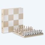• The board and pieces are made of wood, while the box—crafted from high-quality art paper—opens like a book and fits seamlessly among coffee table or art books