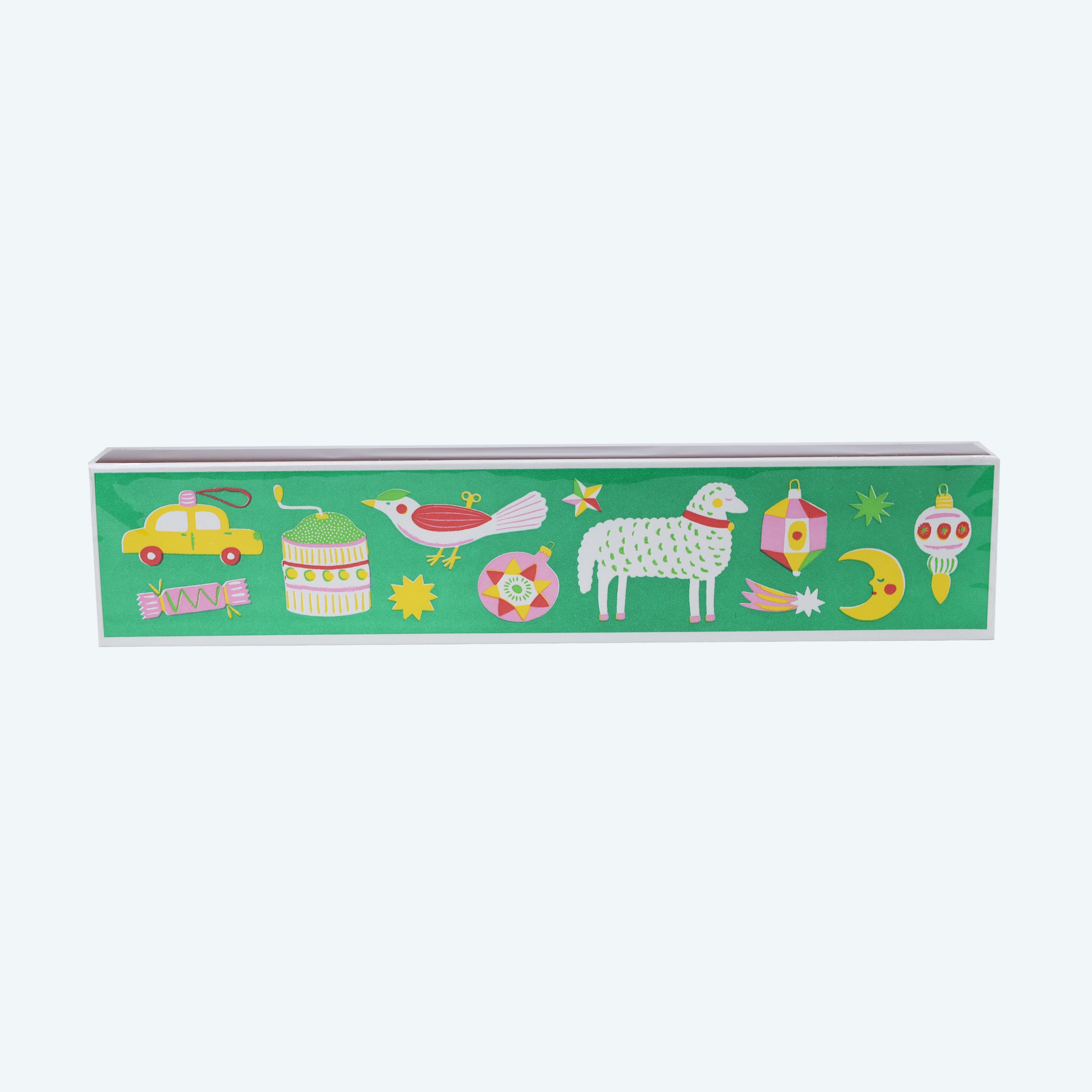 • Featuring an array of Christmas ornaments in various bright colours on a bold green background