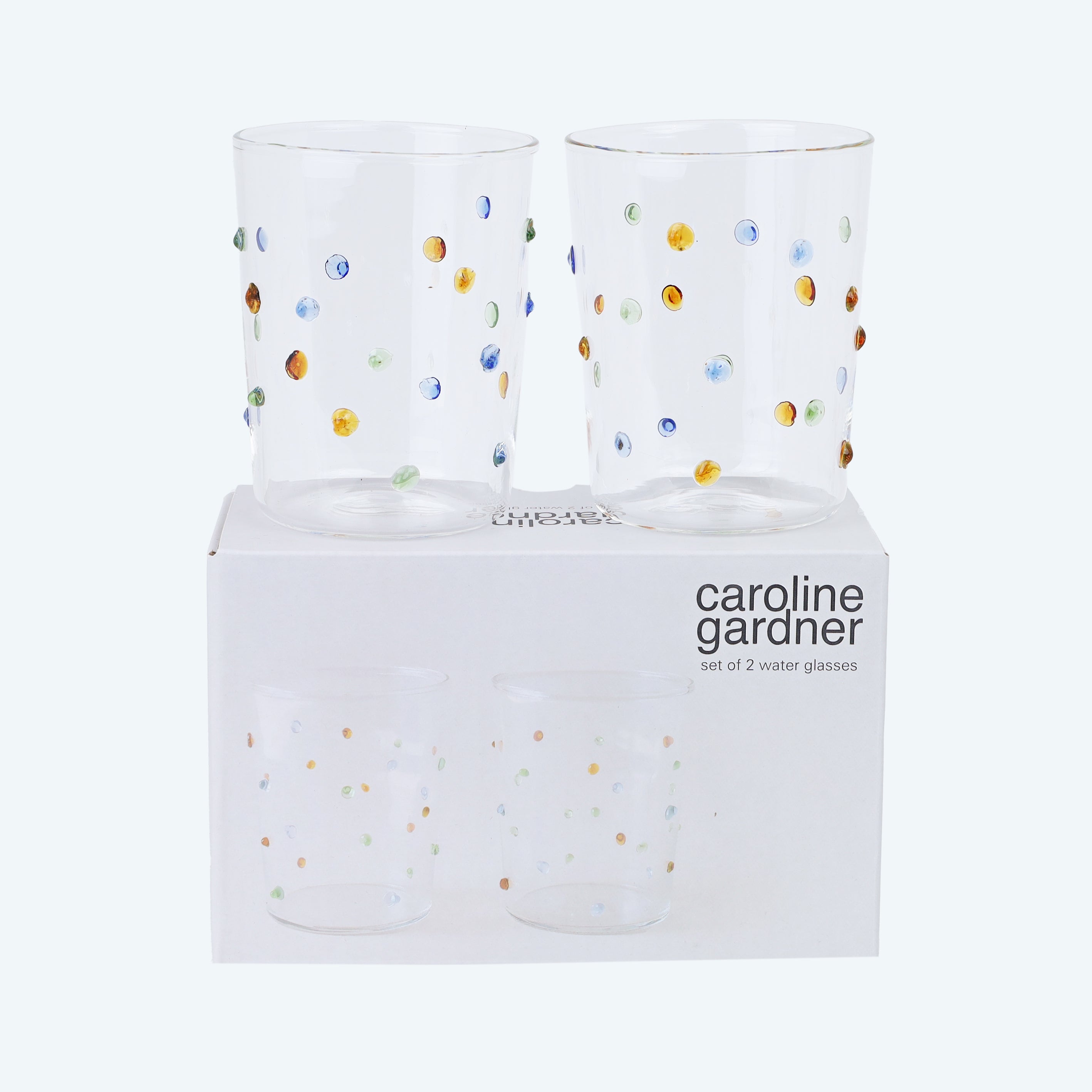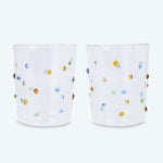 • Add a playful touch to your table with these beautiful hand-blown water glasses featuring multi-coloured dot detailing