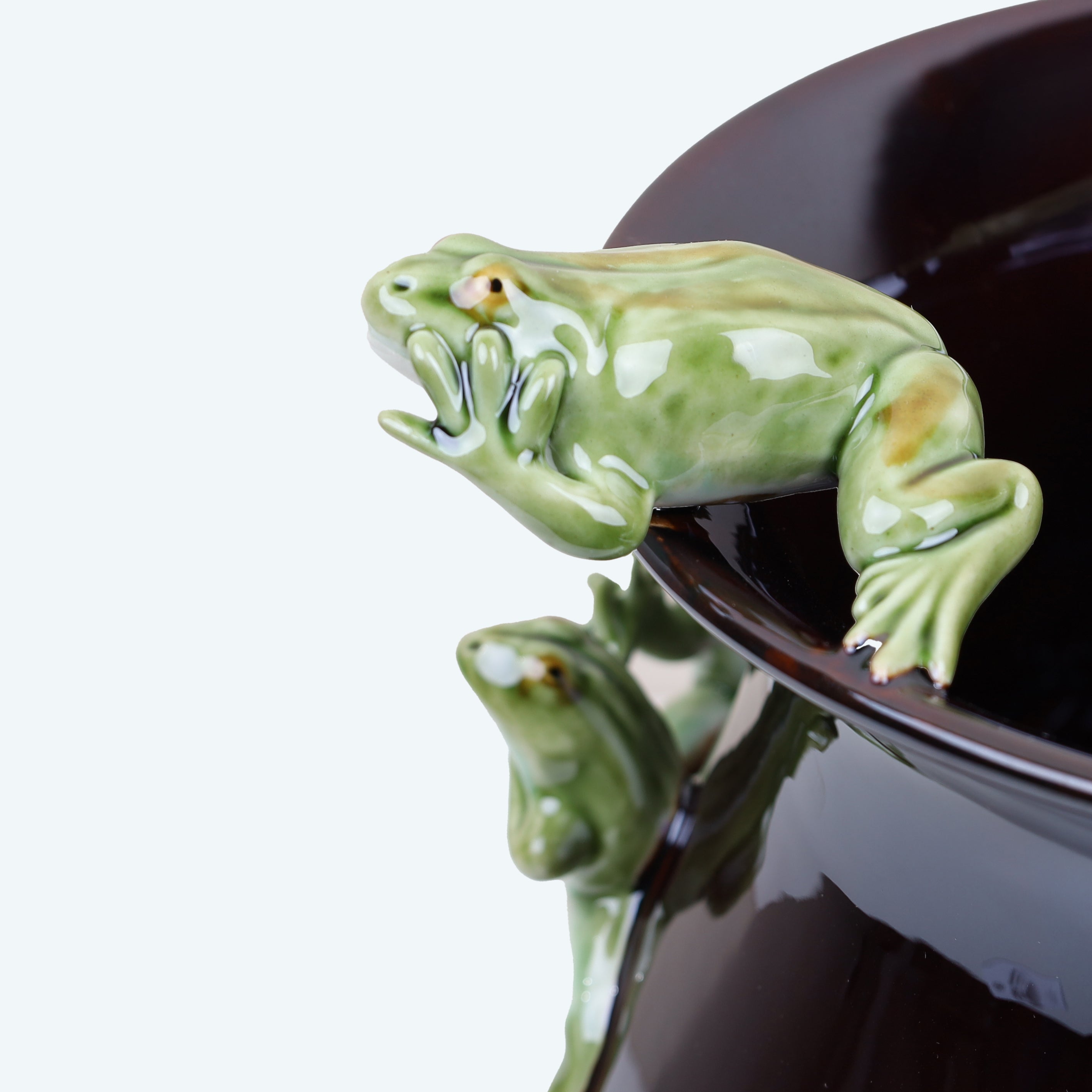 • Handcrafted with exquisite detail, this unique ceramic piece features a lively ring of hand-painted green frogs playfully climbing around a crisp black vase