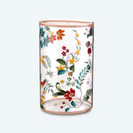 • The glass is of crystal quality with high transparency, mouth-blown and hand-made This thin glass is decorated with a multi-flower color print The rim is finished with a surprising red and white stripe Beautifully combinable with other Berry Blues items