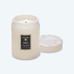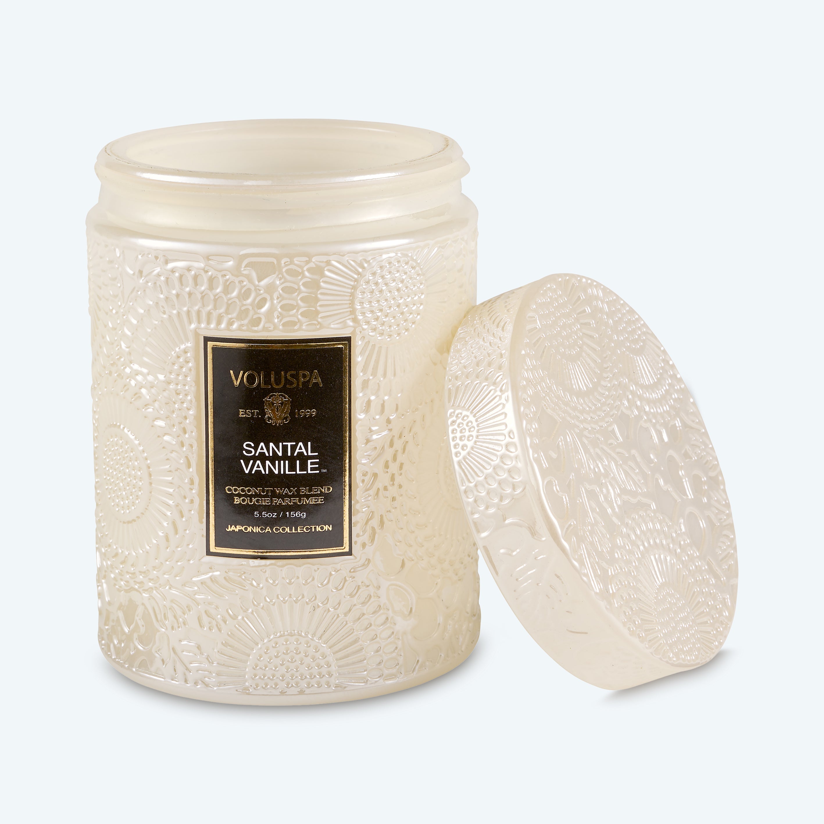 • Voluspa’s 5.5 oz. candle is crafted with a clean-burning coconut wax blend and housed in an embossed glass vessel with a matching lid