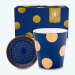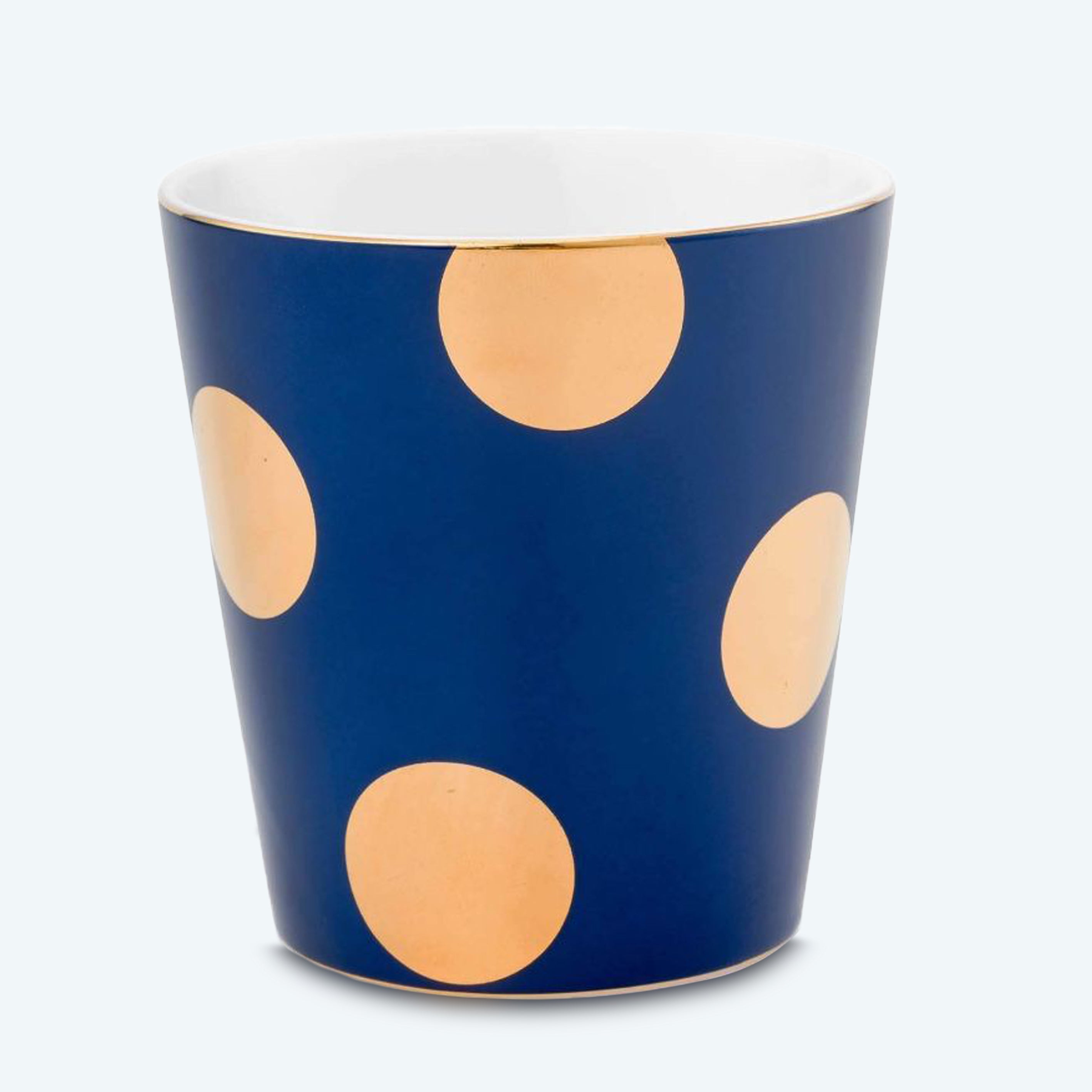 • This charming porcelain mug features a rich navy-blue glaze, adorned with oversized metallic gold polka dots for a bold and stylish look